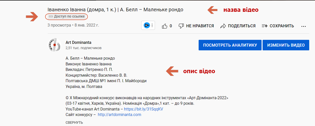 В опиcі під кожним з відео повинна міститись наступна інформація: програма, прізвище/ім’я конкурсанта (назва ансамблю, прізвище/ім’я виконавців), викладач, концертмейстер, назва навчального закладу/організації, країна/населений пункт, назва конкурсу, номінація, вікова категорія.